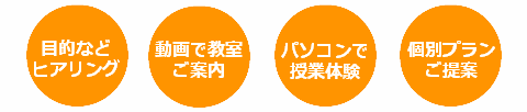 ⇒パソコンを触って授業を体験⇒目的や希望に応じて講習プランをご提案